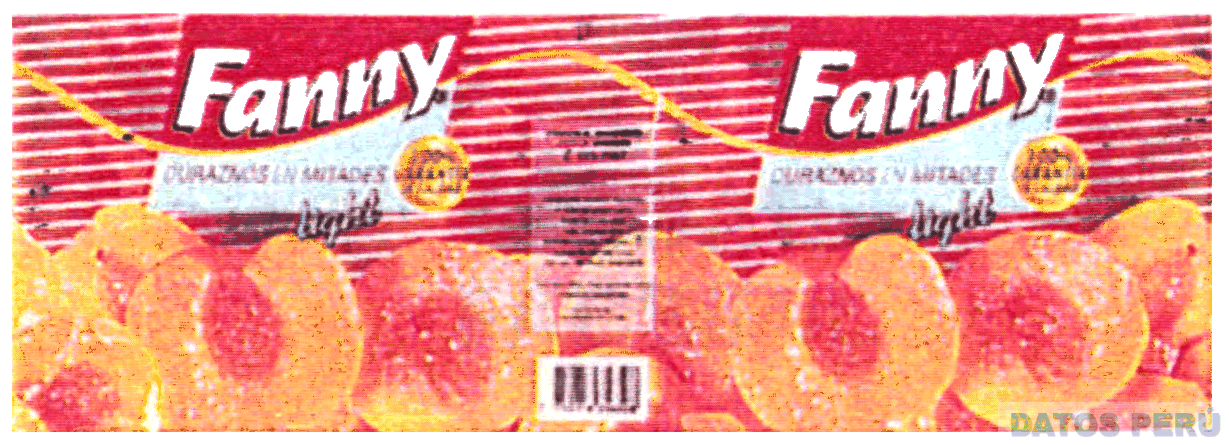 La etiqueta rectangular conteniendo la denominación FANNY LIGHT escrita en letras características en fondo rojo bermellón, con línea ondulante y horizontales en el fondo de la etiqueta y figuras alusivas al producto (duraznos en mitades), en la combinación de colores rojo, negro, celeste claro, amarillo; conforme al modelo adjunto