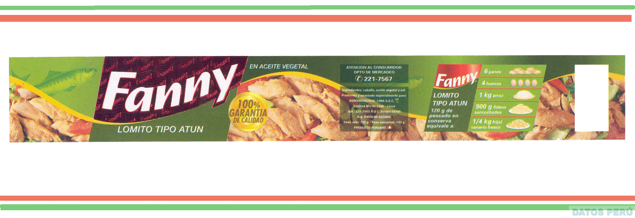 La etiqueta rectangular, en cuyo lado izquierdo se aprecia la denominación FANNY escrita en letras características, al lado derecho los valores nutricionales y como fondo las figuras de filete de pescado, en la combinación de colores rojo, rojo berbellón, verde claro, verde oscuro, beige, blanco y amarillo; conforme al modelo adjunto