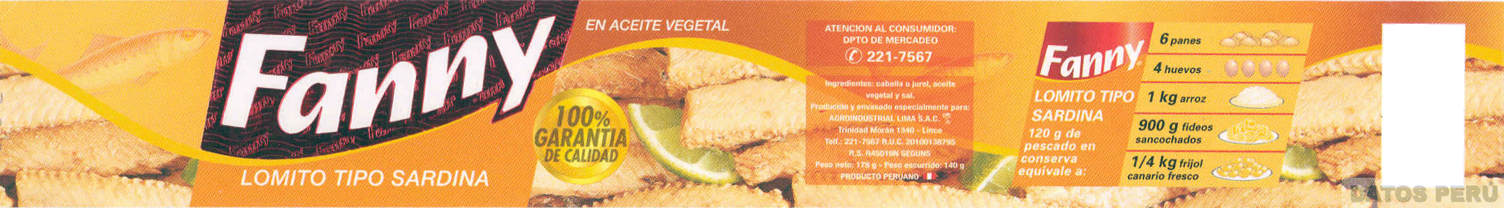 La etiqueta rectangular conformada por la denominación FANNY escrita en letras características en fondo rojo bermellón y letras blancas, al lado derecho la equivalencia nutricional; la figura de trozos de pescado, rodajas de limón en la combinación de los colores rojo bermellón, blanco, beige, amarillo, verde, anaranjado; conforme al modelo adjunto
