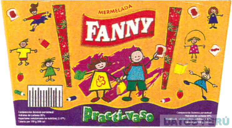 LA ETIQUETA CON LA DENOMINACIÓN FANNY EN FORMA DE BANDERA BICOLOR, CON FIGURAS HUMANIZADAS, DOS BARRAS CÓNICAS CON FRESAS Y EN LA PARTE INFERIOR UNA FRANJA ONDULANTE DONDE SE APRECIA LAS PALABRAS PRACTI-VASO EN COLORES AMARILLO, ROJO, VERDE, BLANCO, CELESTE, MORADO, AZUL, FUCSIA, MARRÓN, ROSADO Y ANARANJADO; CONFORME AL MODELO ADJUNTO