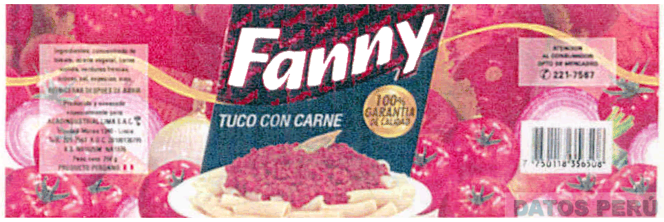 La etiqueta rectangular que contiene la denominación FANNY escrita en letras características en color blanco con fondo rojo y línea ondulante de extremo a extremo, en la parte inferior se aprecian tomates enteros, cebollas y un plato de potaje alusivo al producto y demás leyendas alusivas al producto, en la combinación de colores, rojo berbellón, blanco, amarillo, rosado, anaranjado, fucsia y negro; conforme al modelo adjunto