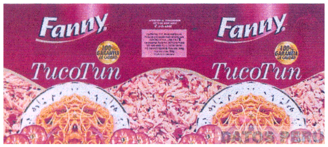 Etiqueta rectangular en fondo color rojo y las denominaciones FANNY y TUCOTUN escrita en letras características, sobre una línea ondulada y en la parte inferior, dos platos que contienen potajes alusivos al producto, adornado con color tomates enteros todo en la combinación de colores blanco, rojo, dorado, beige, negro, sin reivindicar los colores anaranjado y rosado; conforme al modelo adjunto