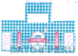 La envoltura con dibujo cuadriculado de fondo y la denominación FAVORITA, sobre la representación de un mazo y su combinación de colores blanco, celeste, rojo y anaranjado, conforme al modelo