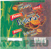 La etiqueta conformada por la denominación FENIX encerrada en un rectángulo, la cual se repite tres veces, al centro se aprecia la denominación RELLENAS escrita en letras características la cual se repite dos veces más en menor tamaño, se aprecia igualmente al centro la representación de tres galletas de chocolates; finalmente aparece la denominación CHOCOLATE encerrada dentro de una figura rectangular la cual se repite tres veces; todo sobre fondo de color verde y marrón, y en los colores rojo, azul, anaranjado, verde y marrón; conforme al modelo adjunto