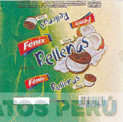 La etiqueta conformada por la denominación FENIX encerrada en un rectángulo, la cual se repite tres veces en diferentes posiciones, al centro se aprecia la denominación RELLENAS escrita en letras características la cual se repite dos veces más en menor tamaño, se aprecian al centro igualmente la representación de tres galletas rellenas y tres cocos, finalmente aparece la denominación COCO encerrada dentro de una figura rectangular, la cual se repite tres veces, todo sobre fondo en los colores verdes, beige y en los colores rojo, azul, marrón anaranjado, beige y blanco; conforme al modelo adjunto