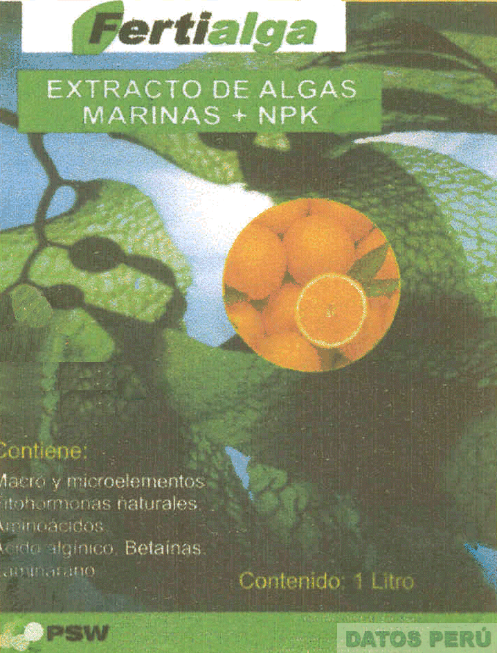 La etiqueta rectangular conformada por un fondo de algas y una circunferencia conteniendo naranjas, en la parte superior se aprecia la denominación FERTIALGA (sin reivindicar) escrita en letras características dentro de una figura rectangular, donde la letra F de la denominación FERTIALGA se encuentra dentro de una hoja, debajo de esto se aprecia una figura rectangular con la denominación EXTRACTO DE ALGAS MARINAS + NPK escrita en letras características (sin reivindicar), debajo se aprecian frases alusivas al producto y una franja con la denominación PSW (sin reivindicar), en los colores anaranjado, verde en distintas tonalidades, azul en distintas tonalidades, blanco y negro; conforme al modelo adjunto