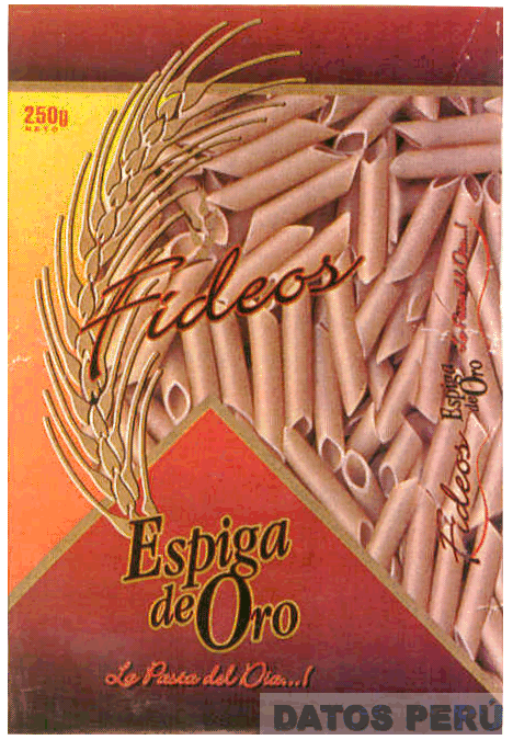 LA ETIQUETA RECTANGULAR CONFORMADA POR LA DENOMINACION FIDEOS ESPIGA DE ORO LA PASTA DEL DIA...! ESCRITA EN LETRAS CARACTERISTICAS, LA FIGURA ESTILIZADA DE UNA ESPIGA DE TRIGO, Y FIGURAS GEOMETRICAS, REIVINDICANDO LA COMBINACION DE COLORES ROJO EN DEGRADE, AMARILLO, ANARANJADO, NEGRO, DORADO Y BEIGE; CONFORME AL MODELO ADJUNTO