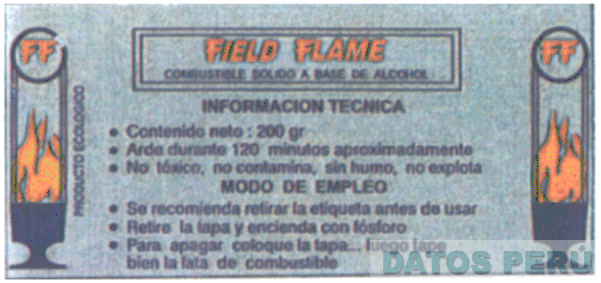 LA DENOMINACION FIELD FLAME, DENTRO DE UN RECTANGULO ENTRE LAS FIGURAS DE DOS ANTORCHAS Y SOBRE ELLAS UN CIRCULO CON LAS LETRAS FF EN SU INTERIOR Y DOS PARES DE RAYAS VERTICALES, SIN REIVINDICAR LA INFORMACION, EN LOS COLORES PLATA, AZUL Y ANARANJADO; CONFORME AL MODELO ADJUNTO,