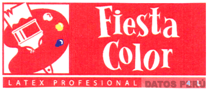 La etiqueta conformada por la denominación FIESTA COLOR LATEX PROFESIONAL escrita en forma característica sobre un rectángulo de color rojo, a la izquierda se observa la figura de una brocha y una paleta sobre la cual se ha colocado pintura blanca, amarilla y azul; conforme al modelo adjunto