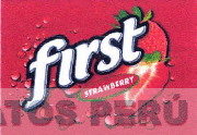 El logotipo conformado por la denominación FIRST STRAWBERRY escrita en letras características, en cuya parte inferior se aprecia la palabra STRAWBERRY dentro de una figura elíptica y en el fondo, figuras que asemejan burbujas, en el lado derecho se encuentran dos fresas, todo en los colores rojo, verde, blanco y negro en distintas tonalidades; conforme al modelo adjunto