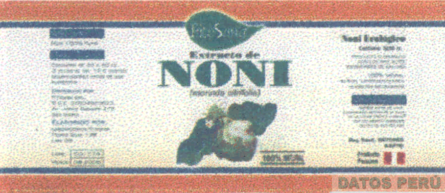 El logotipo conformado por la denominación FITOSANA escrita en letras características dentro de la figura de una hoja; debajo la denominación EXTRACTO DE NONI (MORINDA CITRIFOLIA), sin reivindicar, escrita en letras características y la representación del fruto NONI, a los costados se aprecian frases alusivas al producto, todo en los colores azul, verde, anaranjado y crema; conforme al modelo adjunto