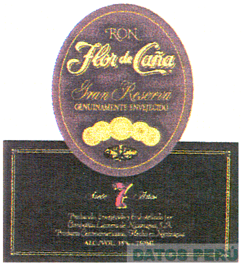LA ETIQUETA COMPUESTA POR UNA FIGURA ELIPTICA Y OTRA DE FORMA RECTANGULAR. DENTRO DE LA FIGURA ELIPTICA SE ENCUENTRA LA PALABRA RON EN COLOR DORADO OSCURO, LA DENOMINACION FLOR DE CAÑA EN COLOR ORO METALICO CON SOMBRA DORADA OSCURA DEBAJO, LAS PALABRAS GRAN RESERVA EN COLOR DORADO OSCURO, E INMEDIATAMENTE DEBAJO, LAS PALABRAS GENUINAMENTE ENVEJECIDO TAMBIEN EN DORADO OSCURO Y MEDALLAS DE PREMIOS ESTAMPADAS EN ORO METALICO, SEGUIDO POR EL OVALO DE LAS PALMERAS EN COLOR DORADO OSCURO Y NEGRO. DENTRO DE LA FIGURA RECTANGULAR HAY DOS LINEAS DORADAS, Y CENTRADO, CONTINUA EL NUMERO 7, EN COLOR ROJO Y SOMBRA DORADA OSCURA, EN TIPO ARABIGO CON LAS PALABRAS SIETE A LA IZQUIERDA Y AÑOS A LA DERECHA; CONFORME AL MODELO ADJUNTO