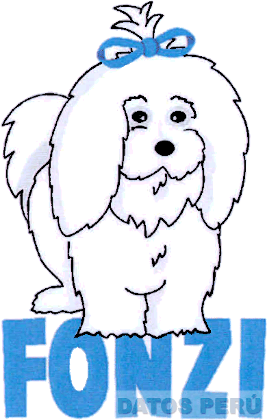 El logotipo conformado por la denominación FONZI escrita en letras características, en la parte superior se aprecia la figura de un perro con un lazo, todo en los colores blanco, negro y azul; conforme al modelo adjunto