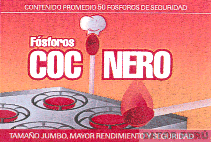 La etiqueta conformada por la denominación FOSFOROS COCINERO escrita en letras características donde la letra I de la palabra COCINERO está representada por la figura de un fósforo con gorro de cocinero, ello sobre la figura de la parte superior de una cocina con cuatro hornillas y un fósforo encendido, todo en los colores anaranjado en degradé, rojo, blanco y gris; conforme al modelo adjunto