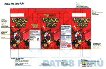 EL ENVASE (TETRA PAK) DE COLOR ROJO, CON LA DENOMINACION "FRESCO SOLO" EN LETRAS CARACTERISTICAS DE COLOR AMARILLO Y AZUL, ASI COMO LA FIGURA DE PAYASO. TODO CONFORME AL MODELO ADJUNTO,