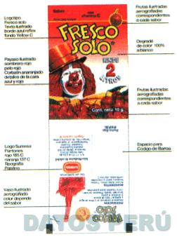 LA ETIQUETA DE COLOR ROJO, CON LA FIGURA DE PAYASO Y LA DENOMINACION "FRESCO SOLO" EN LETRAS CARACTERISTICAS EN COMBINACION DE LOS COLORES AMARILLO Y AZUL. TODO CONFORME AL MODELO ADJUNTO,