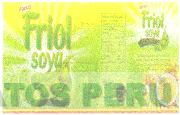 La etiqueta de forma rectangular conteniendo la denominación FRIOL SOYA escrita en letras características, en la parte inferior se aprecia la figura estilizada del fruto de soya, en la parte lateral se aprecia un plato de arroz con pollo y al contorno de éste, figuras de vegetales, como tomate y soya, y demás frases alusivas al producto, (sin reivindicar) todo en los colores blanco, verde en dos tonalidades, amarillo, rojo y marrón; conforme al modelo adjunto