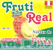 La denominación FRUTI REAL escrita en letras características, en la parte central el diseño estilizado de una piña cortada y la representación de una cinta, apreciándose alrededor diversas leyendas alusivas al producto, todo en la combinación de colores verde, rojo, amarillo, anaranjado, blanco y negro; conforme al modelo adjunto.