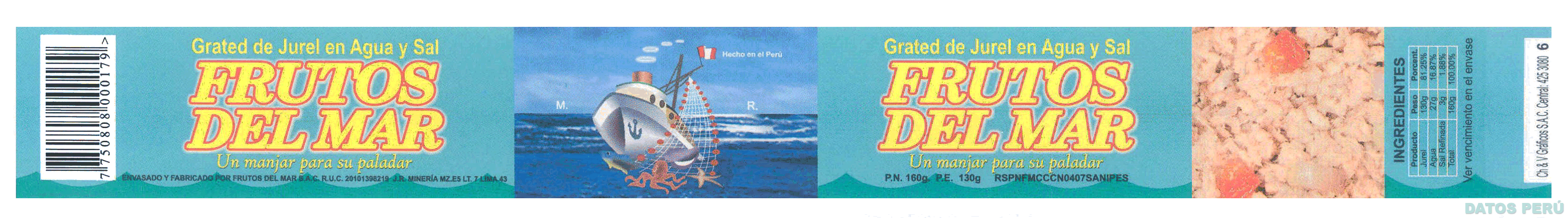 La etiqueta dividida en cuatro secciones en la primera y en la segunda se aprecia la denominación FRUTOS DEL MAR escrita en letras características y demás frases alusivas al producto (sin reivindicar) y una franja ondulante en la parte inferior; en la segunda sección, la representación estilizada de una lancha, en la parte superior tiene la bandera del Perú (sin reivindicar) y humo, además de un ancla, una red, un pescado, un pulpo, una ballena, una estrella del mar, el cielo y el mar; en la cuarta sección la representación del contenido del producto y demás frases alusivas al producto (sin reivindicar), todo en la combinación de colores verde en distintas tonalidades, amarillo, rojo, azul en diversas tonalidades, blanco, marrón en diversas tonalidades, plomo, beige, anaranjado en diversas tonalidades y morado; conforme al modelo adjunto