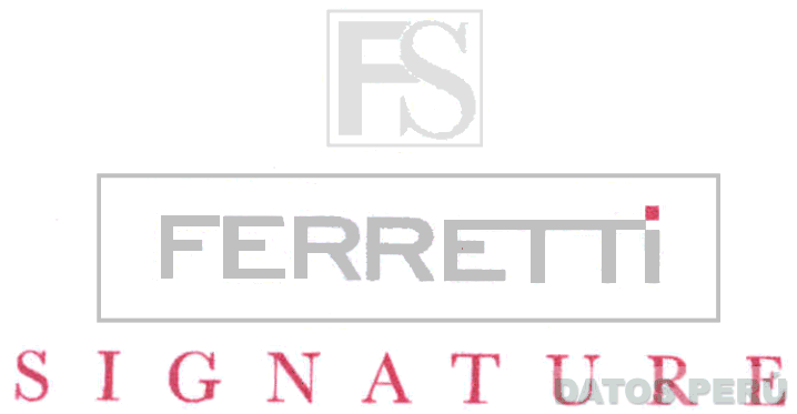 El logotipo conformado por la denominación FERRETTI SIGNATURE escrita en letras características, donde la primera palabra se encuentra dentro de un rectángulo y en el centro; en la parte superior se aprecia un cuadrado que contiene las letras F y S estilizadas; todo en los colores gris y rojo; conforme al modelo adjunto