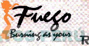 El logotipo conformado por la denominación FUEGO, debajo de ésta la frase BURNING AS YOUR, ambas escritas en letras características; con la representación estilizada de la letra R; todo antecedido de la figura estilizada de una persona, en la combinación de colores anaranjado y negro, sobre un fondo marrón claro con blanco; conforme al modelo adjunto