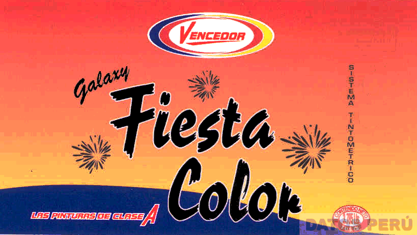 La denominación GALAXY FIESTA COLOR escrita en forma característica, sobre un fondo en la combinación de colores azul y rojo en degradé al amarillo, acompañado de la representación estilizada de fuegos artificiales, en la parte superior se observa el logotipo constituido por la denominación VENCEDOR dentro de un óvalo en colores amarillo, azul y rojo; en la parte inferior se aprecia la denominación LAS PINTURAS DE CLASE A escrita en letras características; conforme al modelo adjunto