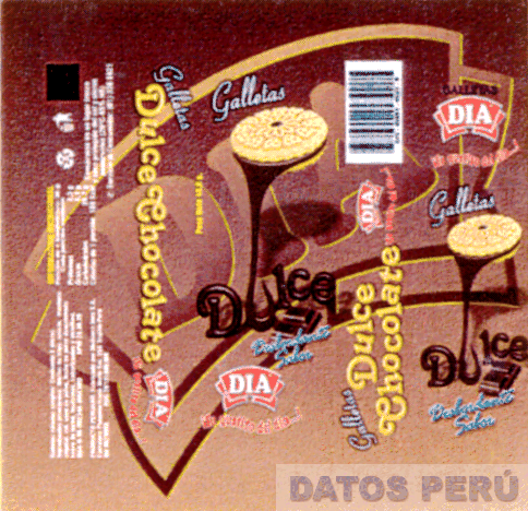 LA ETIQUETA RECTANGULAR CON LAS DENOMINACIONES GALLETAS DULCE CHOCOLATE DIA Y FIGURAS DE GALLETAS Y TENIENDO FIGURAS LINEALES Y GEOMETRICAS IRREGULARES, REIVINDICANDO LOS COLORES