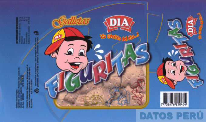 LA ETIQUETA RECTANGULAR CON LA DENOMINACION GALLETAS FIGURITAS DIA, LA FIGURA DE LA CABEZA DE UN NIÑO CON GORRA, DE UNA TORTUGA, UN ELEFANTE Y UN CONEJO Y TENIENDO FIGURAS LINEALES Y GEOMETRICAS IRREGULARES, REIVINDICANDO LOS COLORES