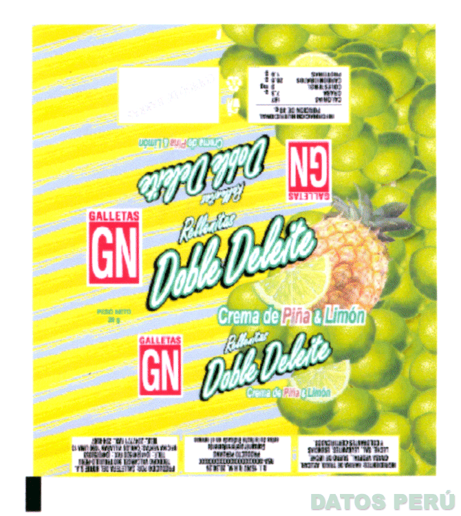 LA ENVOLTURA QUE CONTIENE LA DENOMINACION GALLETAS GN ASI COMO LA DENOMINACION RELLENITAS CREMA DE PIÑA & LIMON, LA REPRESENTACION DE UNA PIÑA Y VARIOS LIMONES, TODO EN LOS COLORES VERDE OSCURO, VERDE CLARO, MARRON, ROJO, BLANCO, AMARILLO Y ALUMINIO; CONFORME AL MODELO ADJUNTO