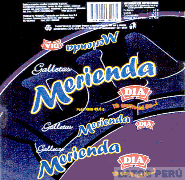 LA ETIQUETA RECTANGULAR CONTENIENDO LAS DENOMINACIONES GALLETAS MERIENDA DIA Y DEMAS FIGURAS GEOMETRICAS IRREGULARES Y LINEAS CURVAS, REIVINDICANDO LOS COLORES