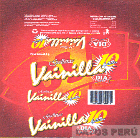 LA ETIQUETA RECTANGULAR CONTENIENDO LAS DENOMINACIONES GALLETAS VAINILLA DIA Y FIGURAS GEOMETRICAS IRREGULARES CARACTERISTICAS, REIVINDICANDO LOS COLORES