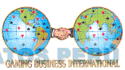 LA DENOMINACIÓN GAMING BUSINESS INTERNATIONAL ESCRITA EN LETRAS CARACTERÍSTICAS, EN LA PARTE SUPERIOR LA REPRESENTACIÓN ESTILIZADA DE DOS GLOBOS TERRÁQUEOS Y DOS MANOS DÁNDOSE UN APRETÓN, EN LA COMBINACIÓN DE COLORES AZUL, VERDE, ROJO, MARRÓN, MELÓN, NEGRO, BLANCO Y CELESTE SIN REIVINDICAR EL COLOR MELÓN; CONFORME AL MODELO ADJUNTO