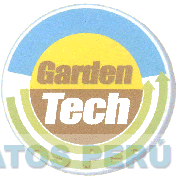 El logotipo conformado por una figura circular donde se aprecia un segmento de color celeste y dos flechas estilizadas de color verde; al centro se aprecia una figura circular que se encuentra dividida en dos horizontalmente en color amarillo y marrón que contiene la denominación GARDEN TECH escrita en letras características en colores marrón y blanco; conforme al modelo adjunto