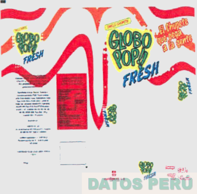 EL EMPAQUE RECTANGULAR DE COLOR BLANCO HUMO CON FRANJAS ONDEADAS EN LA PARTE SUPERIOR Y LA DENOMINACION GLOBO POP!! FRESH ESCRITA EN LETRAS CARACTERISTICAS UBICADO EN DIVERSAS PARTES DEL EMPAQUE, EN EL EXTREMO SUPERIOR DERECHO LA DENOMINACION EL CHUPETE QUE PEGA A LA GENTE ESCRITA EN LETRAS CARACTERISTICAS Y EN LA PARTE INFERIOR LA DENOMINACION CONFIPERU S.A. ESCRITA EN LETRAS CARACTERISTICAS Y UNA FIGURA CUADRANGULAR JUNTO CON DOS LEYENDAS, TODO EN LOS COLORES ROJO, ANARANJADO, AZUL, VERDE, AMARILLO Y BLANCO; CONFORME AL MODELO ADJUNTO