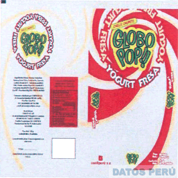 EL EMPAQUE RECTANGULAR DE COLOR BLANCO HUMO Y FRANJAS ESPIRALADAS DE COLOR ROJO Y BLANCO, EN EL EXTREMO DERECHO SE APRECIA LA DENOMINACIÓN GLOBO POP!! ESCRITA EN LETRAS CARACTERÍSTICAS DE COLOR VERDE CON FONDO AMARILLO, RODEADA DE LA FRASE YOGURT FRESA ESCRITA EN LETRAS CARACTERÍSTICAS DE COLOR BLANCO CON BORDES ROJOS, EN LA PARTE IZQUIERDA SE APRECIA LA DENOMINACIÓN GLOBO POP!! ESCRITA EN LETRAS CARACTERÍSTICAS DE COLOR VERDE SOBRE FONDO AMARILLO, YOGURT FRESA ESCRITA EN LETRAS CARACTERÍSTICAS EN COLOR BLANCO Y ROJO; CONFORME AL MODELO ADJUNTO