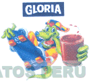 El logotipo conformado por la denominación GLORIA escrita en letras características dentro de una figura rectangular, debajo de la cual se aprecia la representación caricaturizada de un lagarto sobre un skate sosteniendo un vaso con leche chocolatada y con un sorbete en su interior, todo en la combinación de colores azul, verde, blanco, rojo, amarillo y marrón; conforme al modelo adjunto
