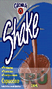 La etiqueta rectangular conformada por la denominación SHAKE escrita en letras características de color blanco con borde azul, en cuya parte superior se observa la denominación GLORIA escrita en letras características de color azul y debajo la figura de un clavel de color rojo en cuyo interior se aprecia la figura de la cabeza de una vaca en los colores blanco y negro; asimismo, en la parte inferior se aprecia la figura estilizada de un vaso que contiene una bebida de color marrón y demás frases alusivas al producto en colores amarillo y blanco; todo sobre un fondo de color azul y plomo; conforme al modelo adjunto