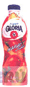 La etiqueta conformada por una botella que contiene la figura de mangos en colores rojo, verde y anaranjado en degradé, en cuyo lado superior se aprecia la figura característica de un remolino de color blanco en degradé, que contiene la denominación YOGURT escrita en letra caracteríticas de color celeste, debajo se aprecia la denominación GLORIA escrita en letras características de color azul y la figura de un clavel de color rojo en cuyo interior se aprecia la figura de la cabeza de una vaca en los colores blanco y negro; en el centro de la etiqueta aparece la denominación MANGO BEBIBLE escrita en letras características de color blanco con bordes de color azul; todo conforme al modelo adjunto