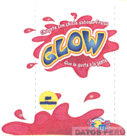 El logotipo conformado por la denominación GLOW y sobre ésta, la frase CHUPETE CON CHICLE SABOR A FRESA y debajo, la frase QUE LE GUSTA A LA GENTE, escritas en letras características, todo dentro de una figura irregular, en la parte inferior derecha la denominación GOLOSINAS TROME escrita en letras características, sobre una figura irregular, así como la representación de diversas gotas tanto en la parte superior como inferior, todo en los colores rojo, azul, blanco, amarillo, fucsia, celeste, anaranjado; conforme al modelo adjunto