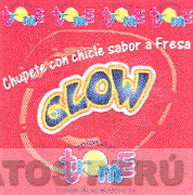 La envoltura con la denominación GLOW y sobre ésta, la frase CHUPETE CON CHICLE SABOR A FRESA, ambas escritas en letras características, todo dentro de una figura en forma de remolino, al lado superior e inferior la denominación GOLOSINAS TROME escrita en letras características, todo en los colores rojo, azul, blanco amarillo, fucsia, celeste, anaranjado; conforme al modelo adjunto