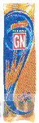 La etiqueta de color azul y dorado, conteniendo las letras GN escrita en letras características de color blanco sobre un fondo rectangular de color rojo con bordes blancos, en la parte superior aparece la denominación FIDEOS en color blanco; debajo la representación de espigas en color dorado; conforme al modelo adjunto