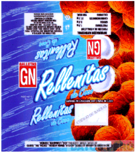 LA ENVOLTURA CARACTERISTICA QUE CONTIENE EN FORMA REPETIDA LA DENOMINACION GN EN COLOR BLANCO Y FONDO ROJO, LA DENOMINACION RELLENITAS EN COLOR BLANCO SOMBREADO DE CELESTE Y AZUL SEGUIDA DE LA DENOMINACION DE COCO Y VARIAS FIGURAS DE COCO, EN LOS COLORES MARRON, BLANCO, CELESTE, AZUL, ROJO Y ALUMINIO; CONFORME AL MODELO