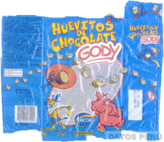 LA BOLSA-EMPAQUE TURQUESA CON LA DENOMINACIÓN GODY ESCRITA EN LETRAS CARACTERÍSTICAS, CON LAS FIGURAS DE UN HIPOPÓTAMO, TORTUGA, JIRAFA, PAPAGAYO, RANA, PÁJAROS Y ABEJAS; EN LOS COLORES AMARILLO, ROJO, AZUL, VERDE Y MARRÓN; ASÍ COMO LA DENOMINACIÓN ARCOR ESCRITA EN LETRAS CARACTERÍSTICAS (SIN REIVINDICAR LA DENOMINACIÓN HUEVITOS DE CHOCOLATE), CONFORME AL MODELO
