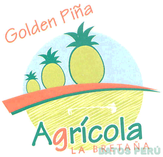 El logotipo conformado por la denominación GOLDEN PIÑA escrita en letras características y la representación estilizada de tres piñas sobre un campo de cultivo dentro de un círculo y la denominación AGRÍCOLA LA BRETAÑA escrita en letras características, en los colores anaranjado, verde en dos tonalidades, celeste y blanco; conforme al modelo adjunto