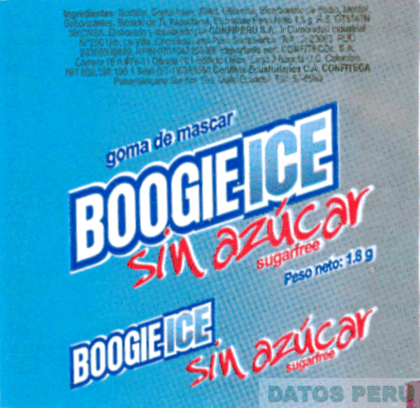La etiqueta conteniendo la denominación GOMA DE MASCAR BOOGIE ICE SIN AZÚCAR SUGARFREE escrita en letras características, donde el término GOMA DE MASCAR se aprecia en letras minúsculas encima de la denominación BOOGIE ICE, todo ello por encima del término SIN AZÚCAR SUGARFREE y demás leyendas alusivas al producto, en la combinacion de colores celeste, plateado, azul, rojo y blanco; conforme al modelo adjunto