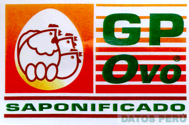 LA ETIQUETA CONFORMADA POR EL DIBUJO ESTILIZADO DE 3 POLLOS Y 3 HUEVOS DENTRO DE UNA FIGURA OVOIDE; EN EL MARGEN DERECHO LA DENOMINACION GP OVO ESCRITA EN FORMA CARACTERISTICA SOBRE LINEAS EN DEGRADE Y EN LA PARTE INFERIOR LA DENOMINACION SAPONIFICADO ENTRE LINEAS, EN LOS COLORES VERDE, MARRON, ROJO, ANARANJADO, BEIGE Y BLANCO; CONFORME AL MODELO ADJUNTO,
