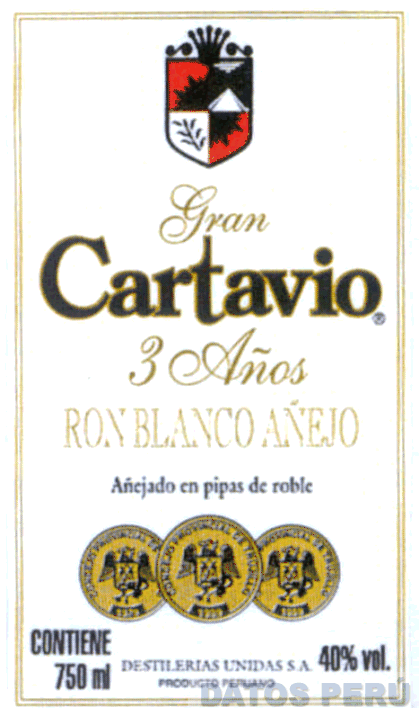 EL LOGOTIPO CONFORMADO POR LA ETIQUETA RECTANGULAR DE COLOR BLANCO CON BORDES DORADOS CONTENIENDO EN LA PARTE SUPERIOR LA FIGURA DE UN ESCUDO CON LA REPRESENTACION DE UNA CORONA, UN SOL, UNA PLANTA DE CAÑA Y UN DEPOSITO DE BARRILES EN COLORES DORADO, ROJO, NEGRO Y BLANCO, DEBAJO APARECE LA DENOMINACION GRAN CARTAVIO EN COLORES DORADO Y NEGRO RESPECTIVAMENTE CON BORDES DE COLOR DORADO, SEGUIDA POR LA DENOMINACION 3 AÑOS RON BLANCO AÑEJO ESCRITA EN LETRAS CARACTERISTICAS EN COLOR DORADO, EN LA PARTE INFERIOR APARECEN TRES CIRCULOS CONTENIENDO ESCUDOS, EN COLORES NEGRO Y DORADO; CONFORME AL MODELO ADJUNTO