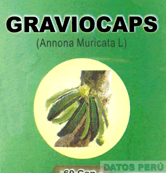 La etiqueta conteniendo la denominación GRAVIOCAPS escrita en letras características, en la parte inferior entre paréntesis la denominación ANNONA MURICATA L (sin reivindicar) escrita en letras características, la representación de una planta dentro de un círculo, en los colores verde oscuro, verde claro, amarillo, negro; conforme al modelo adjunto