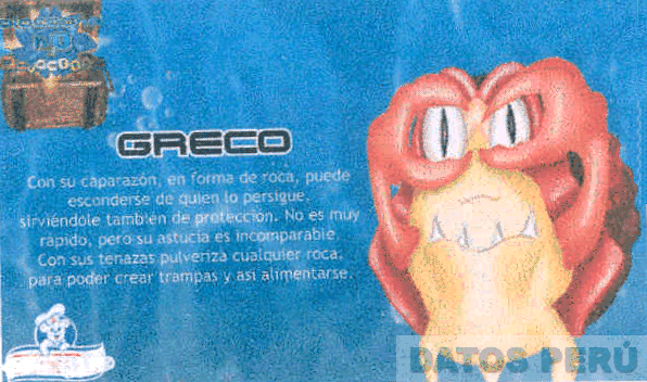La denominación GRECO escrita en letras características, las figuras de un cangrejo y un oso estilizados, y demás frases sin reivindicar, en colores anaranjado, amarillo, celeste, azul, blanco, rojo, negro y marrón; conforme al modelo adjunto