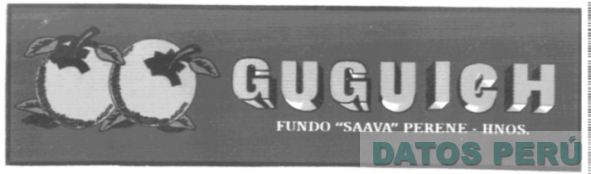 EL LOGOTIPO CONFORMADO POR LA DENOMINACION GUGUICH ESCRITA EN LETRAS CARACTERISTICAS Y EN LA PARTE INFERIOR LA DENOMINACION FUNDO "SAAVA" PERENE - HNOS. Y EN EL LADO IZQUIERDO SE APRECIA LA FIGURA DE DOS NARANJAS CONFORME AL MODELO ADJUNTO,